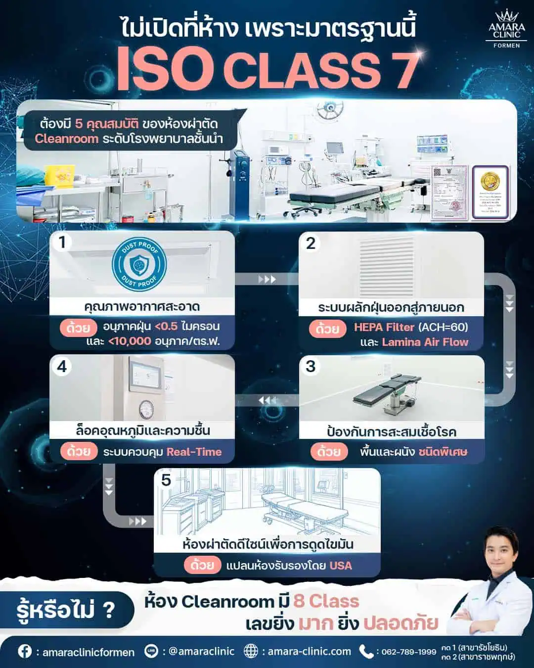 หลายคนอาจจะสงสัยว่าทำไม AMARA ถึงไม่มีสาขาในห้าง ถ้าไปเปิดในห้างมันก็น่าเชื่อถือกว่าหรือเปล่า? – ต้องขอสารภาพความจริงว่าที่ AMARA ไม่ยอมขึ้นห้างเพราะเราต้องการยกระดับมาตรฐานของห้องผ่าตัด ให้เข้าสู่ระดับสากลครับ! เนื่องจากในห้างนั้นไม่สามารถสร้างห้องผ่าตัดที่ครบถ้วนตามมาตรฐาน ISO Class 7 ได้ ทั้งเรื่องของระบบไฟสำรองฉุกเฉิน คุณภาพอากาศ ระบบความดันบวก การตัดตั้งพื้น-ผนังลดการสะสมของเชื้อโรค การดีไซน์ห้องผ่าตัดให้เหมาะกับการดูดไขมัน หรือแม้แต่ระบบผลักฝุ่นออกนอกห้องอย่าง HEPA Filter และ Laminar Air Flow