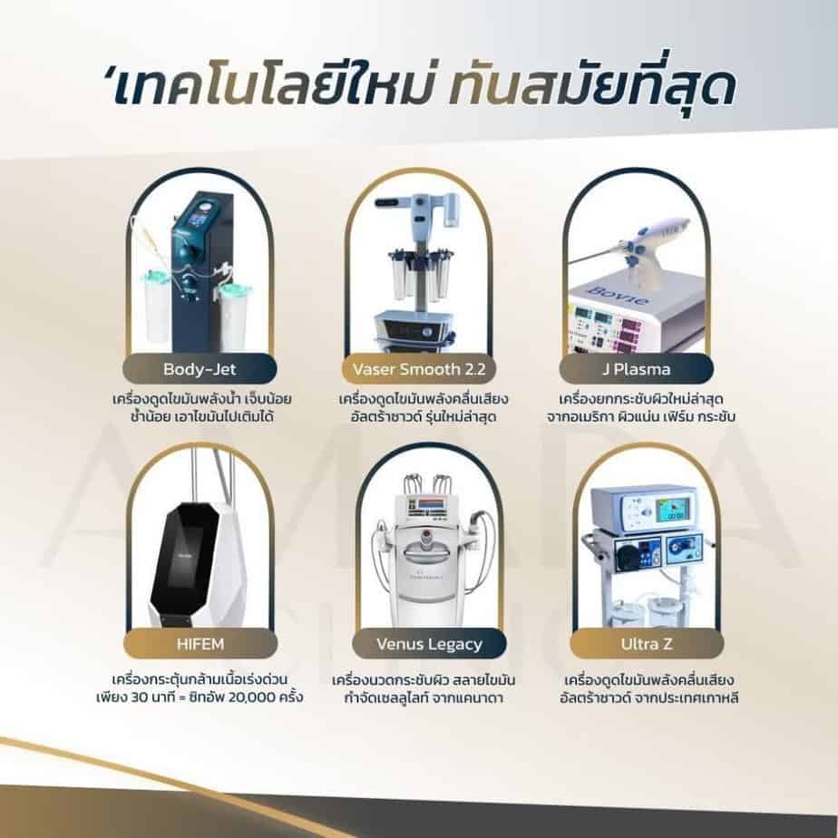 อย่างของหมอมีเครื่องดูดไขมันหลายเครื่อง มีครบทุกแบบให้เลือกใช้เพื่อรองรับเคสดูดไขมันแต่ละเคสให้เหมาะสมที่สุด และที่สำคัญมาก ๆ คือหมอใช้แต่เครื่องที่ได้มาตรฐาน เป็นเทคโนโลยีที่ทันสมัย เห็นผลจริง ๆ เลยทำให้ราคาของเครื่องมือมีราคาสูงขึ้นตามไปด้วย เช่น เครื่องดูดไขมัน Ultra Z ที่เป็นเครื่องจากประเทศเกาหลี, เครื่องดูดไขมันเวเซอร์ รุ่นใหม่ล่าสุด Vaser Smooth 2.2 จากสหรัฐอเมริกา, เครื่องดูดไขมันพลังน้ำ Body-jet เทคโนโลยีจากเยอรมันที่มีความเจ็บช้ำน้อยมาก และเอาไขมันไปเติมต่อได้ เครื่อง BodyTite Pro ทางเลือกของสายประหยัด รวมไปถึงเครื่องกระชับผิว J Plasma ด้วยครับ อันนี้นำเข้าจากสหรัฐอเมริกา ซึ่งหมอใช้เป็นเครื่องรุ่นใหม่ทั้งหมด และเลือกใช้ตามความเหมาะสมของแต่ละเคสเป็นหลัก