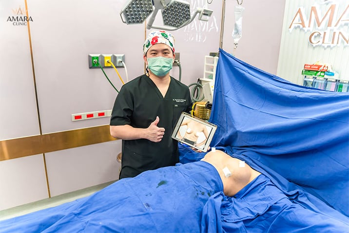 - เย็บปิดแผลเติมไขมันหน้าอก และแผลดูดไขมันให้เรียบร้อย ก่อนที่จะพาคนไข้ไปพักผ่อนในห้องพักฟื้นระดับ VVIP ของทางคลินิก